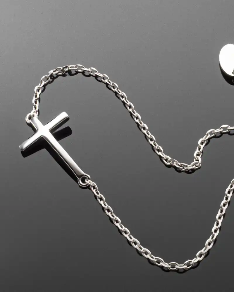 Brățara din argint pentru glezna este un accesoriu subtil, perfect pentru a adăuga semnificație stilului tău. Confecționată din argint 925 placat cu rodiu, această brățară atrage privirile prin strălucirea sa discretă. Crucea, un simbol al protecției și echilibrului, completează armonios designul, transformând-o într-un element rafinat ce poate fi purtat zilnic.