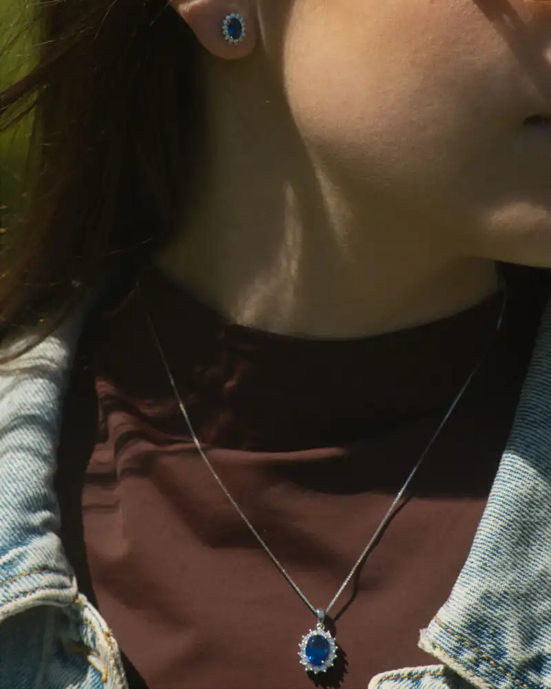 Piatra centrală: Safir creat în laborator, de 7 x 9 mm, cu o nuanță profundă de albastru regal și claritate VVS excepțională, înconjurat de zirconii strălucitoare pentru un efect sofisticat.