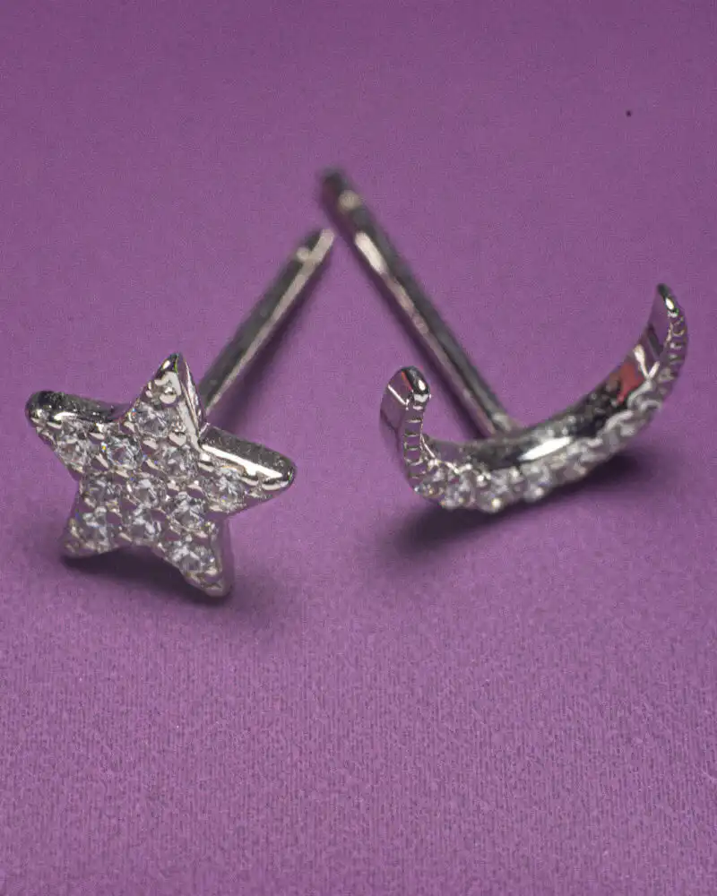 Cercei din argint 925 placat cu rodiu, unul în formă de stea, celălalt în formă de lună. Această asimetrie aduce o armonie încântătoare între design și simbolistică. Argintul 925 oferă cerceilor durabilitate și strălucire, în timp ce placarea cu rodiu asigură protecție împotriva coroziunii. Simbolul stelei evocă aspirații înalte și inspirație, în timp ce luna simbolizează misterul și feminitatea. Această pereche de cercei adaugă unicitate și eleganță oricărei ținute, reprezentând o expresie subtilă a personalității și stilului tău.