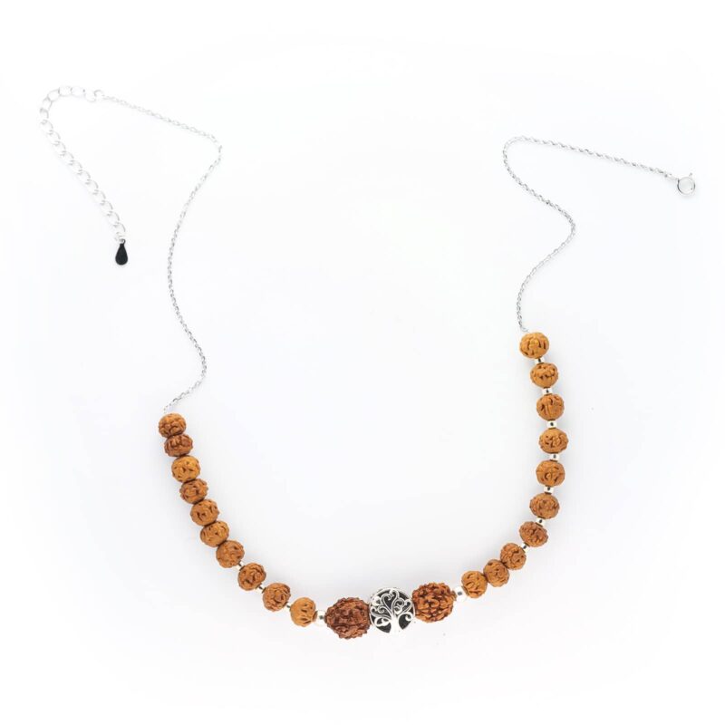 Colierul este lucrat manual cu o atenție deosebită la detalii, ceea ce îl face cu adevărat special. Semințele de Rudraksha sunt amplasate cu grijă în designul acestui colier, creând un efect vizual captivant aducând o stare de liniște interioară.