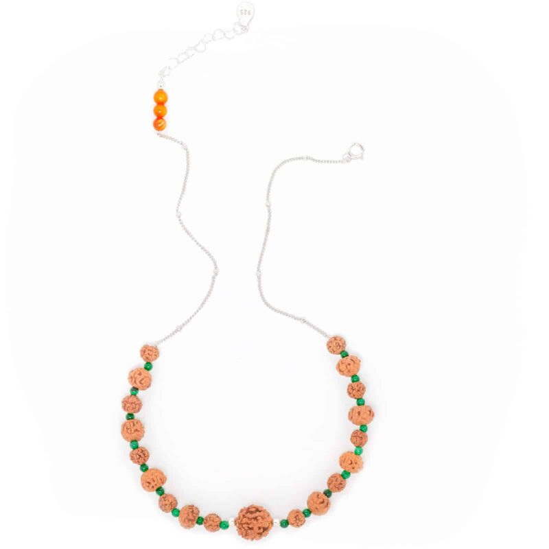 Shanti este un colier din argint exclusiv creat pentru Yllo, o bijuterie rafinată și simbolică, care îmbină eleganța metalului prețios cu puterea spirituală a semințelor de rudraksha, recunoscute pentru proprietățile lor de protecție și echilibru. Această biojuterie unică include, de asemenea, pietre naturale de agat și coral, oferind purtătorului o energie purificatoare și revitalizantă.